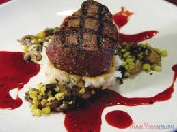 Fine dining 15 Published May 7, 2016 at 275 × 183 in Fine dining 15 Flamed,Black wildebeest or White-tailed gnu (Connochaetes gnou) filet, matured in amasi served on a béarnaise sauce with wilted greens ← Previous Next →