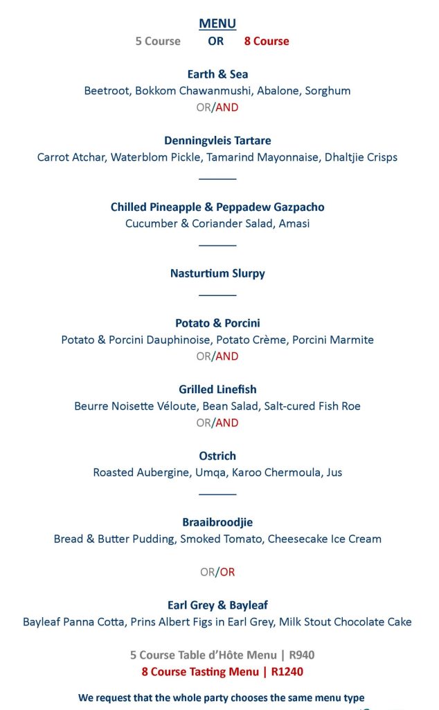 This menu is inspired by our beautiful and bountiful locale. We begin on the sandy beaches of our coastline and travel inland all the way to the plains of the Great Karoo.